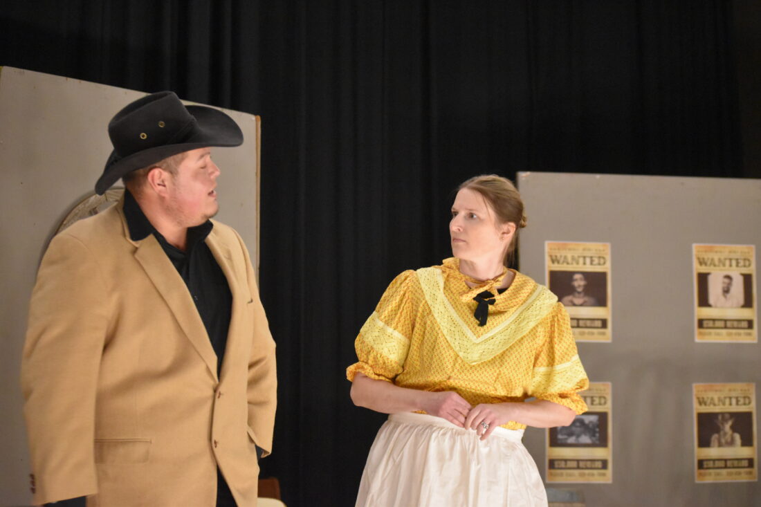 - Staff photo by Fritz Busch Farm boy looking for a wife, Ken Johnson, left, listens to mercantile clerk Kelli Sorenson in “The Groom Has Cold Feet.”