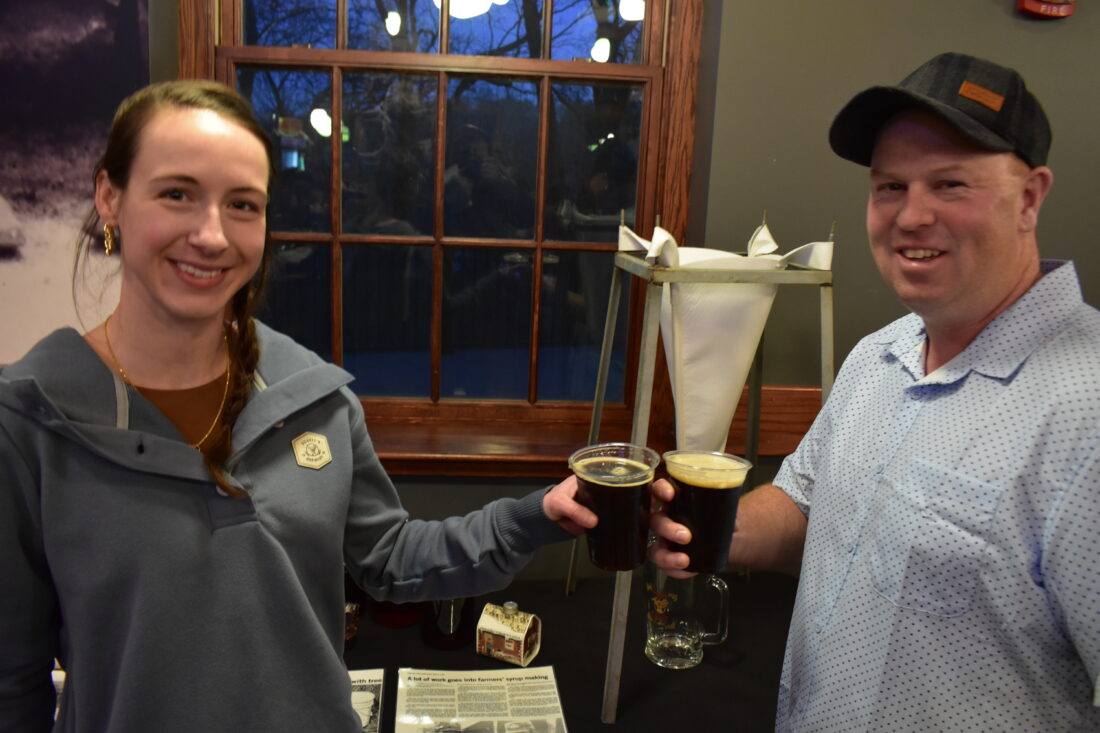 Schell’s brewer Jordan Walls (left) and local maple syrup supplier Matthew Dummer give a cheers to the new limited-release Maple Porter beer avaialbe in Schell’s taproom. A year ago, Dummer and Walls began working together to create a new maple syrup beer for Schell’s. On Friday, a special release party was held for the beer.