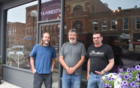 Owners of new cannabis micro business (L to R) Todd Christiansen, Glenn Hauser and Tad Ulrich stand outside their cannabis retail store in July 2025. The store is located at 4 N. Minnesota Street in New Ulm and is named Four North. The storefront has yet to open due to changes in a heavily regulated market, but the owners remain optimistic of opening in 2026. Photo by Clay Schuldt