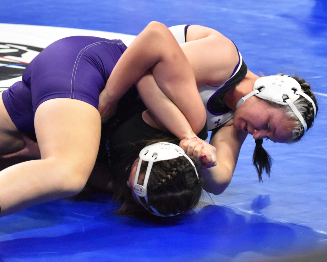 File photo by Ari Selvey New Ulm Area’s Ellie Dake works for a pin against Roseville Area’s Alyssa Diedrich during the Girls State Individual Wrestling Tournament Friday at Grand Casino Arena. Dake was named the All-Journal Co-Wrestler of the Year on Thursday.