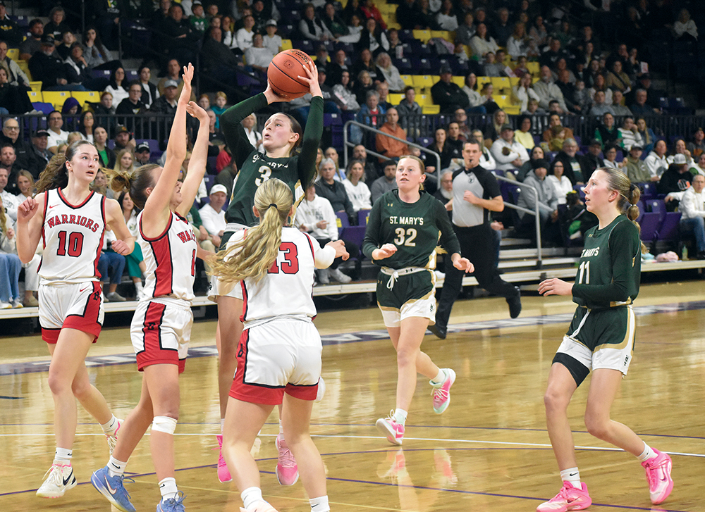 - Staff photo by Ari Selvey Sleepy Eye St. Marys’ Morgan Mathiowetz shoots a jumper during the Section 2A Girls Basketball Championship game against BOLD Friday at the Taylor Center.