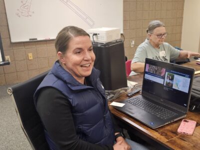 - Megan Benage, Regional Ecologist with the Minnesota DNR, sits beside her laptop presentation during the New Ulm Garden Club’s spring meeting Wednesday evening.