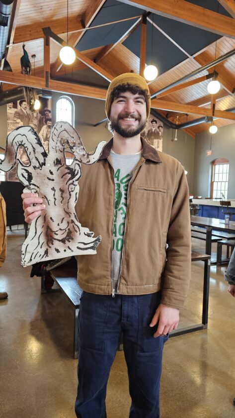- Will Sutherland holds up the bock, a cutout of a goat, after finding it under a pile of logs Saturday at Bockfest at August Schell Brewery. Sutherland was the first to locate a bock in this year’s Bock Hunt, a scavenger hunt held across the festival grounds and surrounding woods. Photo by Amy Zents