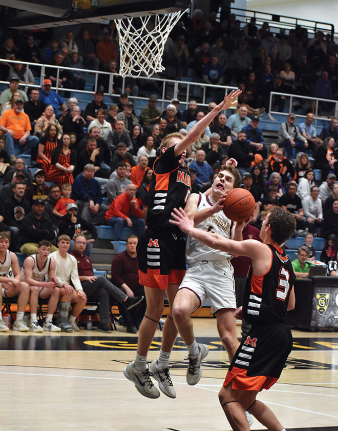 Staff photo by Ari Selvey Springfield’s Madden Lendt drives in for a layup while guarded by Madelia’s Kaydon Firchau and Tate Becker (3) during a Section 2A Boys Basketball Tournament semifinals game Monday at Gustavus Adolphus College. Lendt had a double-double in the win for Springfield with 16 points and 10 rebounds.