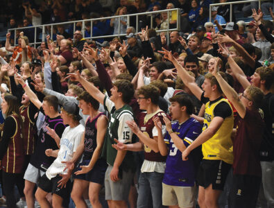 Staff photo by Ari Selvey The Springfield student section celebrates a 3-pointer made by Bryan Buerkle during a Section 2A Boys Basketball Tournament semifinals game against Madelia Monday at Gustavus Adolphus College.
