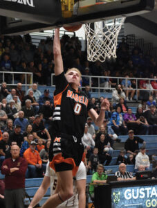 Staff photo by Ari Selvey Madelia’s Kaydon Firchau throws down a dunk during the Section 2A Boys Basketball Tournament semifinals game against Springfield Monday at Gustavus Adolphus College. Firchau finished with 20 points to lead Madelia.