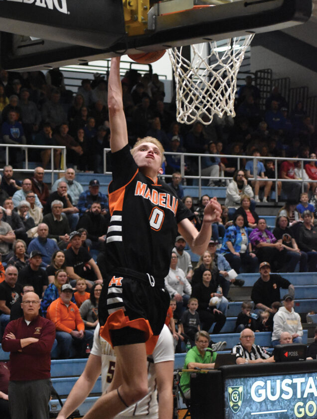 - Staff photo by Ari Selvey Madelia’s Kaydon Firchau throws down a dunk during the Section 2A Boys Basketball Tournament semifinals game against Springfield Monday at Gustavus Adolphus College. Firchau finished with 20 points to lead Madelia.