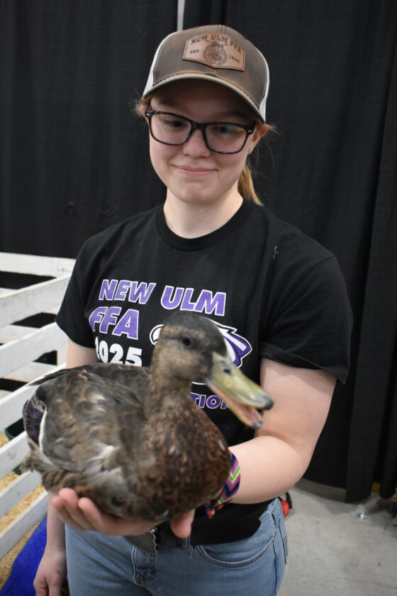 McKenzie Lilleodden with New Ulm FFA holds her duck Jimma to the Farm-City Hub Club Farm Show. The mallard was one of several live animals on display at the show.