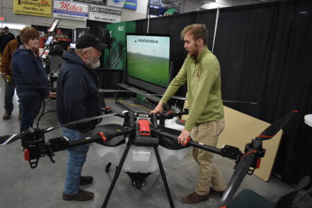 - Britton Pankratz (right) of Mountain View Ag describes the specification for the sprayer drone during the Farm-City Hub Club Farm Show.