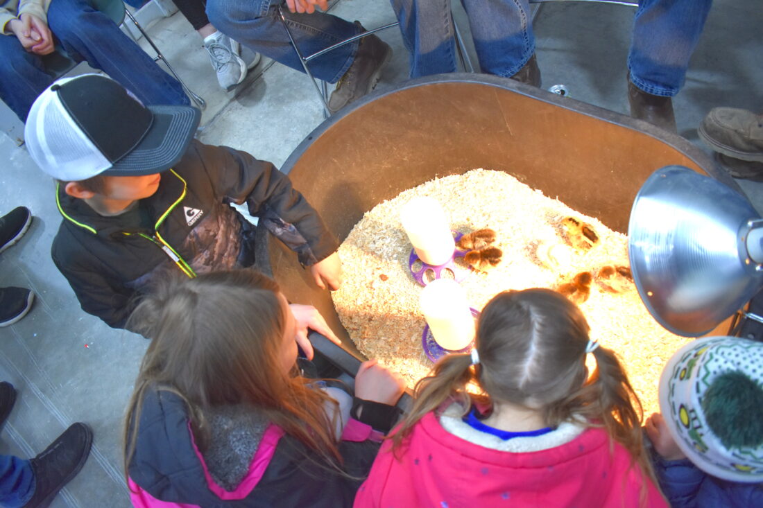 - Sawyer Schugel, Jocelyn Schugel, Aria Schugel and Jace Schugel examine the chicks on display at the New Ulm Future Farmers of America booth.