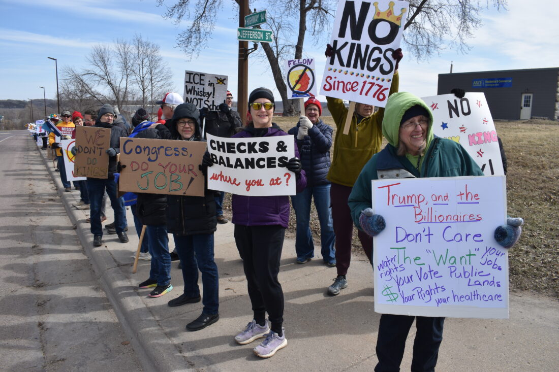 Roughly 370 people attended Saturday’s No Kings Rally in New Ulm, with most lined up along Highway 14. Photo by Clay Schuldt