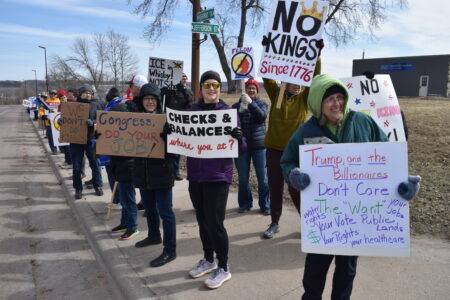 - Roughly 370 people attended Saturday’s No Kings Rally in New Ulm, with most lined up along Highway 14. Photo by Clay Schuldt