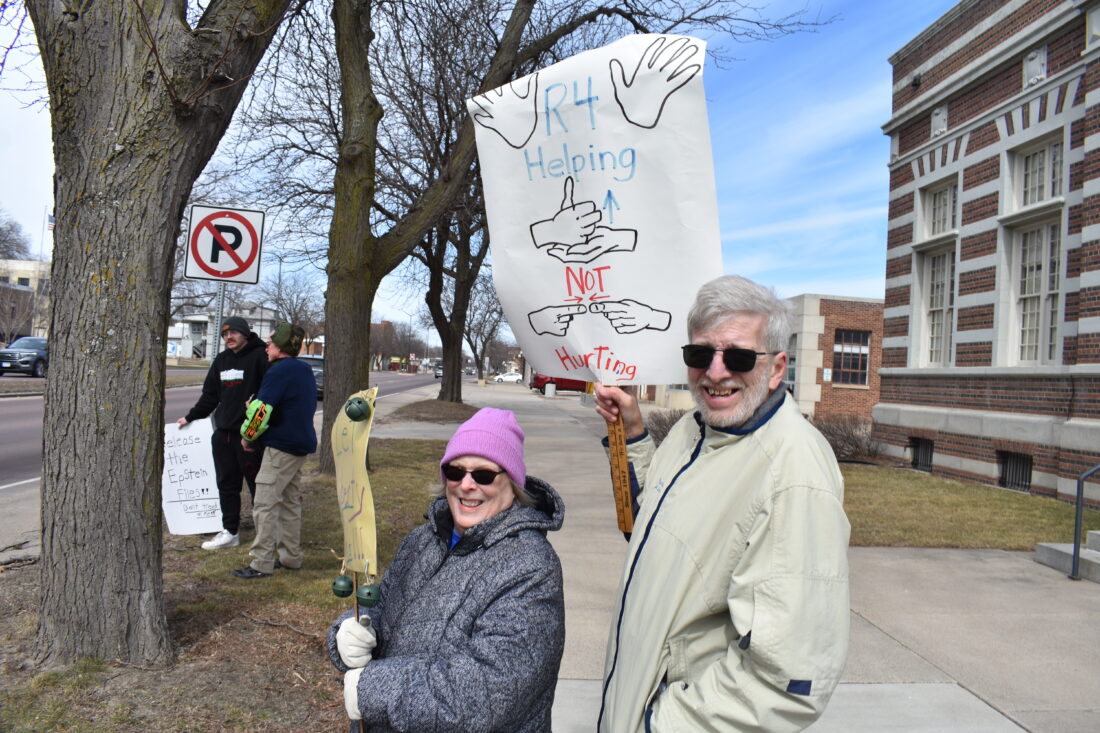 Anne-Donnelly and Sheldon Rieke gathered at the Broadway and Center Street for the No Kings protest. Though most of the protesters were gathered along N. Broadway/Highway 14, Anne Rieke said they preferred Broadway and Center Street because it was at the heart of New Ulm. Photo by Clay Schuldt