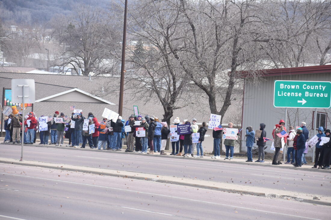 NEW ULM — Several hundred protesters met in North Park to hear speakers and sing before carrying signs and lining the south side of several blocks of North Broadway/Highway 14 Saturday.