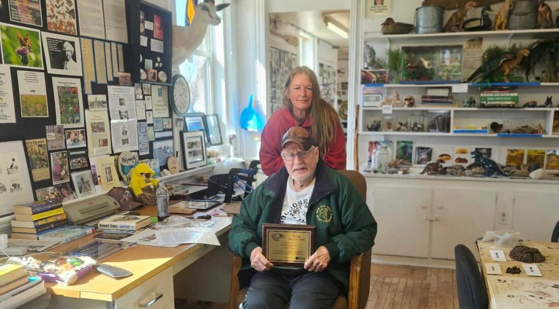 Ron Bolduan, a 2026 ISD Hall of Fame inductee, proudly displays his award alongside his daughter, Lori Wengert at the Riverside Center. Wengert continues her father's legacy by managing the educational center, a testament to his lifelong dedication to nature and wildlife. (Photo by Amy Zents)