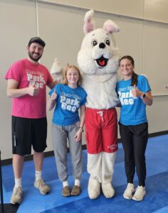 - Park and Rec Program Director Ben Doeden (left) stands with pool staff Jaci Johnson, the Aqua-Bunny, and Zoe Uhde during Friday’s event. Photo by Amy Zents