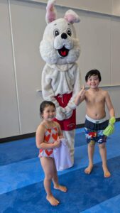 - Rory and Arlo Hsu meet the Aqua-Bunny. Each child received a bag of treats after capturing an egg during the aquatic egg hunt. Photo by Valerie Hsu