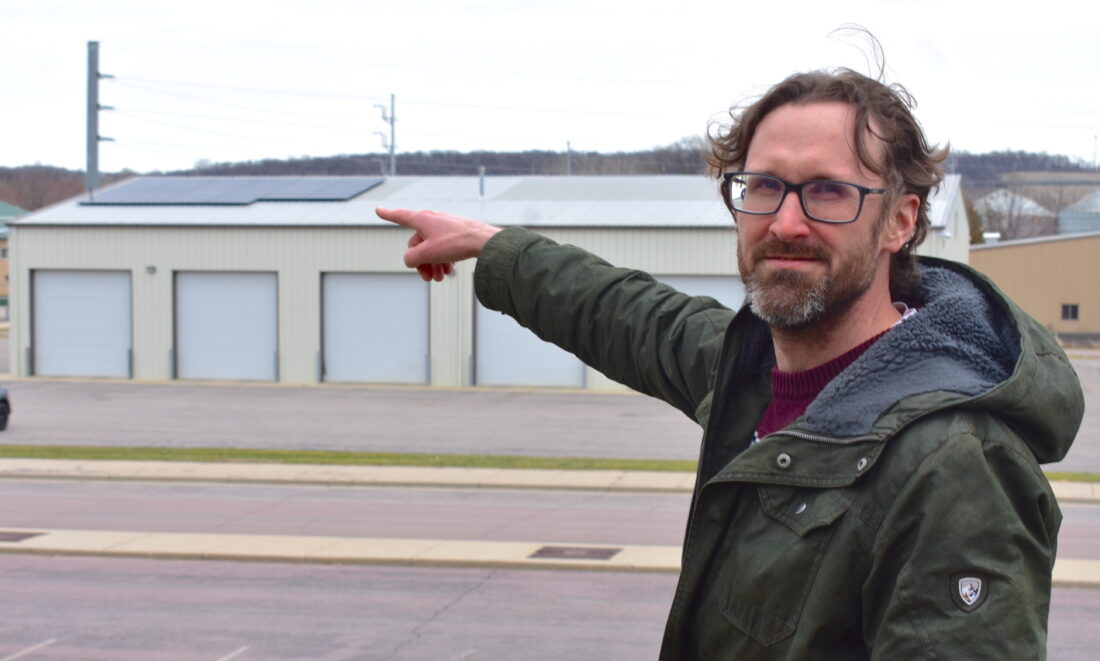 New Ulm Utilities Energy Services Representative Derek Nelson points to the new solar panel array on top of the electric distribution department (EDD) building. The panels are the first in a series of three solar arrays that will be installed on public utility buildings thanks to a Department of Commerce grant. Panels will also be installed on the Natural Gas and Water Department buildings. (Photos by Clay Schuldt)
