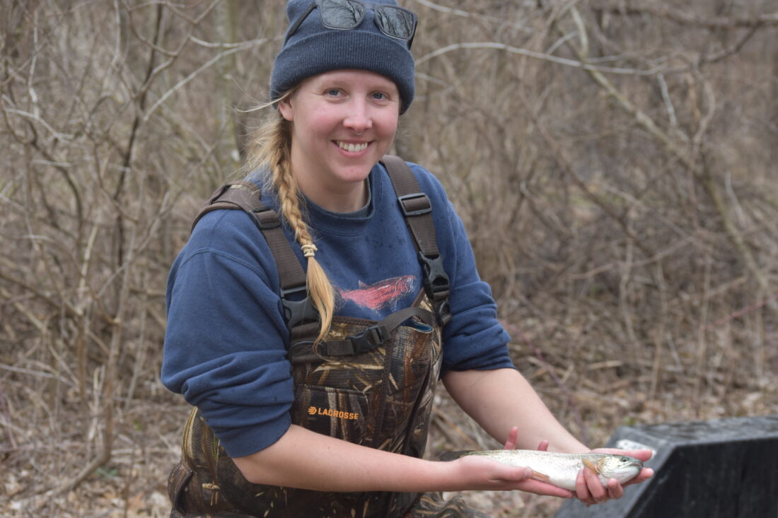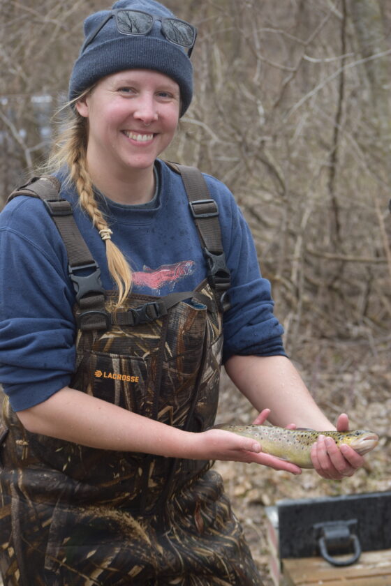 - Staff photo by Fritz Busch Minnesota DNR Fisheries Specialist Hanna Anema holds a brown trout before releasing it to Fort Ridgely Creek at Fort Ridgely State Park Thursday.