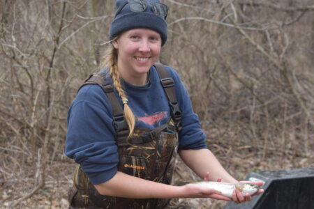 - Staff photo by Fritz Busch Minnesota DNR Fisheries Specialist Hanna Anema holds a trout before releasing it at Fort Ridgely Creek at Fort Ridgely State Park Thursday.