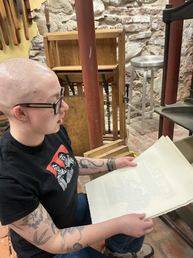 Artist‑in‑Residence Izzy Shinn examines a freshly embossed print inside Cellar Press at The Grand Center for Arts & Culture. Shinn is spending two weeks in the studio producing new intaglio work and preparing materials for an upcoming workshop. Photo by Amy Zents