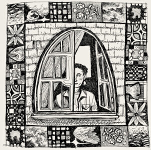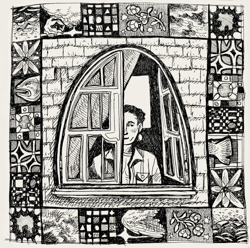- An ink illustration by Izzy Shinn features a figure at an arched window framed by decorative borders. (Illustration by Izzy Shinn)