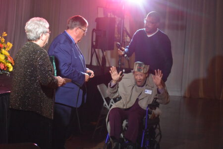 Ninety-nine year old legendary Minneapolis blues singer and pianist James “Cornbread” Harris receives his Minnesota Music Hall of Fame induction plaque during Friday’s induction ceremony at Turner Hall. Harris made a short speech while receiving the award. He said that he not big on bragging, he just plays the piano and lets his “fingers do the bragging.”