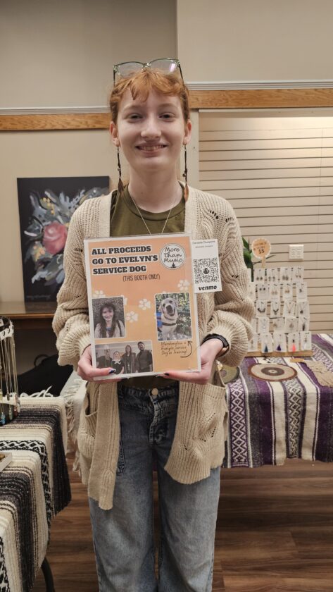 New Ulm ninth-grader Evelyn Nosbush holds a fundraising flyer at the Music & Makers market Saturday at Lykke Books. Nosbush and her family are raising $42,000 for "Marshmallow," a Labrador retriever being trained to detect latex. (Photo by Amy Zents)