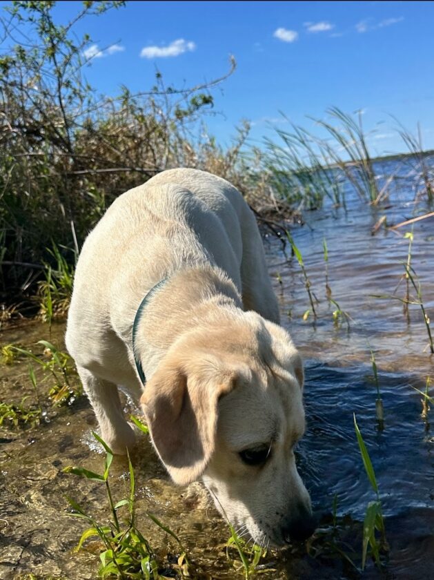Marshmallow, the 7-month-old Labrador retriever training to become a latex-detection service dog for New Ulm ninth-grader Evelyn Nosbush, smells the water at Creating New Tails in Florida. (Photo by Jillian Skalky)