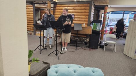 - Michelle Sowers, left, and Reese Klawitter perform for attendees at Lykke Books during the Music & Makers market on Saturday. (Photo by Amy Zents)