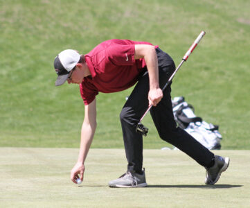 - Staff photo by Travis Rosenau New Ulm Cathedral’s Carter Wilson collects his ball after sinking a putt on Hole 9 during Leg 1 of the Tomahawk-Valley Conference Boys Golf Tournament on Wednesday at Mayflower Golf Club in Fairfax.