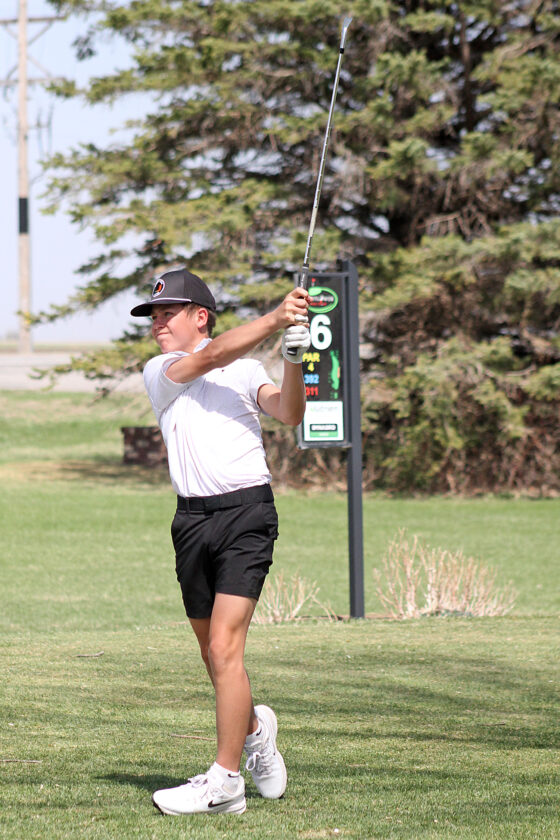 Staff photo by Travis Rosenau Sleepy Eye United’s Anders Coulson hits a tee shot during the first leg of the Tomahawk-Valley Conference Boys Golf Tournament on Wednesday at Mayflower Golf Club in Fairfax.