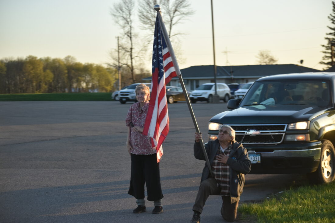 - Staff photo by Fritz Busch A Bianchi welcome home tribute in Green Isle includes this couple and a U.S. flag.