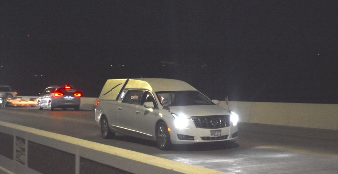 - A little after 9 p.m. Friday, April 24 Capt. Willibald Bianchi’s hearse crosses the 7th N. Street bridge into New Ulm. The Medal of Honor recipient’s remains were official back in his home town 80 years after his death. (Photo by Clay Schuldt)