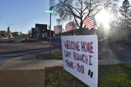 Signs welcoming Capt. Willbald Bianchi home line the path his hearse would take through New Ulm upon his return. Photo by Clay Schuldt