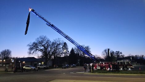 - The New Ulm Fire Department raised an American Flag over 7th N. Street in preparation for the return of Capt. Willibald Bianchi’s remains. The hearse carrying Bianchi would pass directly under the flag. (Photo by Clay Schuldt)
