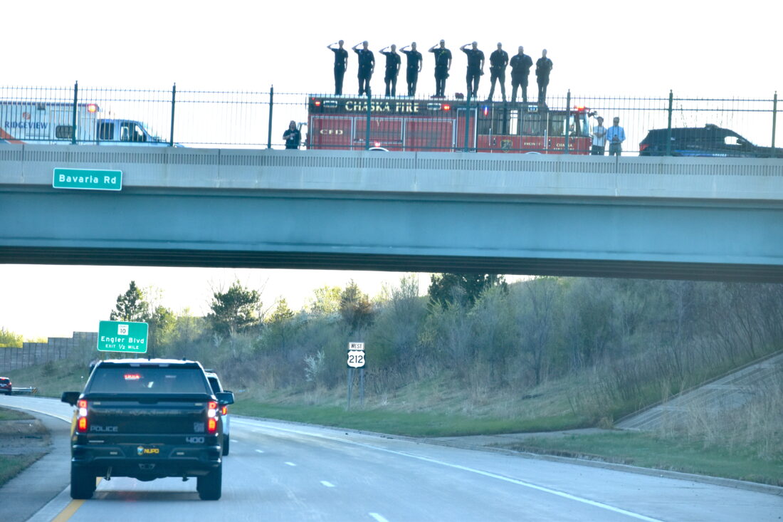 - Staff photo by Fritz Busch Chaska firefighters salute the Bianchi welcome home procession on U.S. Highway 212 Friday.