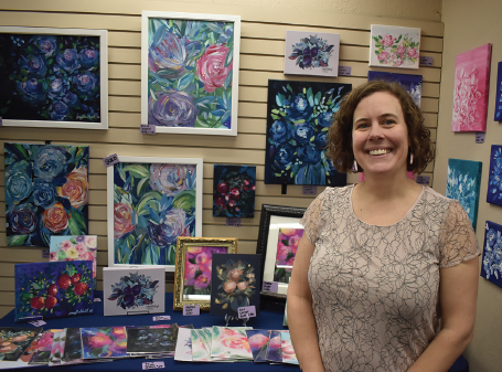 Staff photo by Fritz Busch Lykke Books owner Brie Taralson is pictured with a colorful art display in the store. Taralson said the bookstore has grown to include many local and nationally-known authors. Book subjects range from learning to let go, incite joy, poetry, how to be less miserable and journaling for teens.