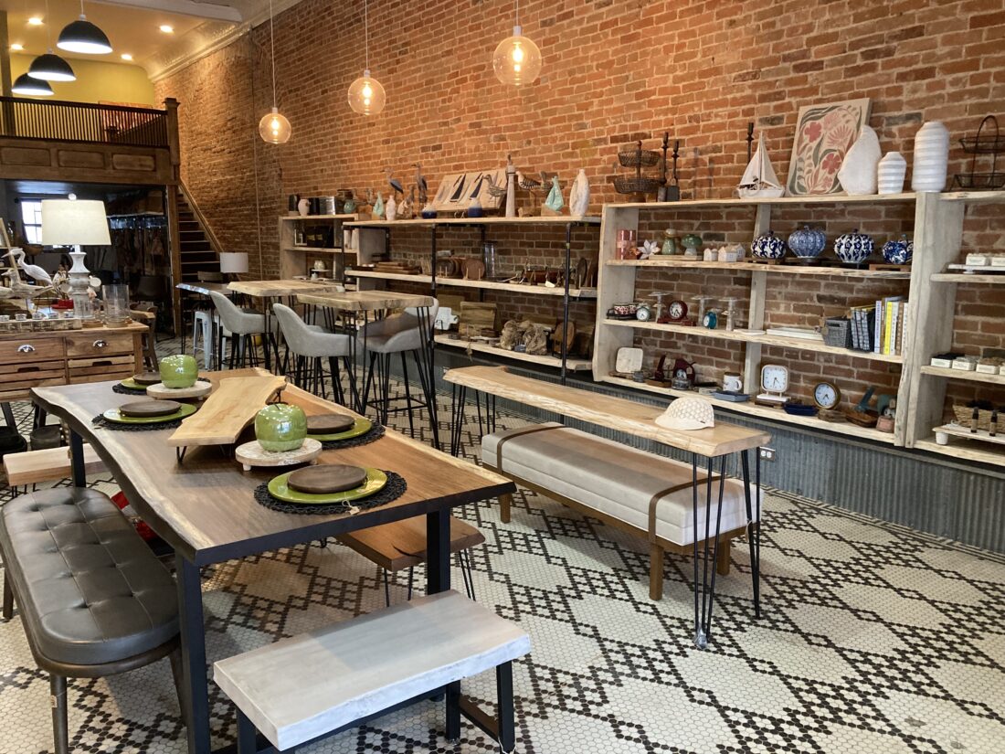 The store specializes in live edge wood furniture and rustic décor which includes pottery, and wood style rustic items.