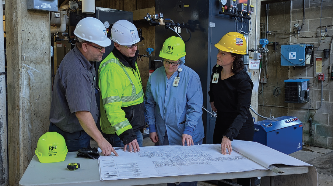 In 2024, New Ulm Medical Center (NUMC) began expansion of its surgical wing. The project will be completed in 2025. Members of NUMC’s team and contractors review the expansion plan. L to R: Tom Larson, Manager, Plant Operations; Ryan Simpson, Superintendent, RJM Construction; Alicia Forstner, Manager, Surgical Services and Carisa Buegler, Director of Operations.