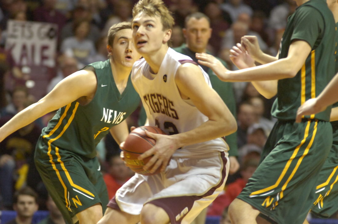Staff photo by Jeremy Behnke Springfield’s Isaac Fink dribbles between Nevis defenders in Springfield's Class A state boys’ basketball quarterfinals win on Thursday at Williams Arena. Fink had 20 points, 10 rebounds and six assists.