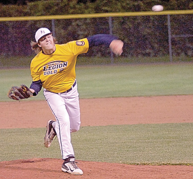 Staff photo by Steve Muscatello New Ulm Legion Gold starting pitcher Nick Fischer tosses a pitch during an Upper Midwest Classic game against LeSueur-Henderson Thursday at Johnson Park in New Ulm. For more photos of this event go to cu.nujournal.com