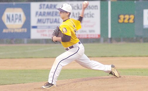 Staff photo by Steve Muscatello New Ulm Legion Gold starting pitcher Tyler Roufs tosses a pitch during Gold’s playoff game against Sleepy Eye on Wednesday in Sleepy Eye. For more photos of this event go to cu.nujournal.com