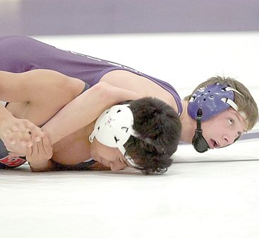 Staff photo by Steve Muscatello New Ulm 106-pound wrestler Carter Brandes (top) defeated Ivan Martinez of Worthington Tuesday at New Ulm High School. For more photos of this event go to cu.nujournal.com