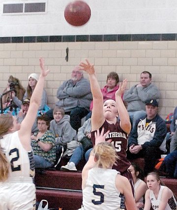 Staff photo by Steve Muscatello New Ulm Cathedral’s Heidi Hoffman (15) launches a shot as two Renville County West defenders look on during the first half Friday in New Ulm. For more photos of this event go to cu.nujournal.com