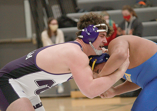 File photo by Travis Rosenau New Ulm Area’s Jaden Drill wrestles at a home triangular earlier this March. He is one of three Eagles that will compete at the state individual wrestling championships this Friday.