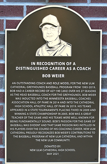 Former New Ulm Cathedral baseball coach Bob Weier was honored by New Ulm baseball with a plaque at Johnson Park. Weier joins the late Cathedral coach Stan Wilfahrt and retired New Ulm High School coach Jim Senske with a permanent plaque at the park.
