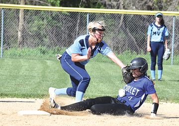 Staff photo by Jeremy Behnke Nicollet’s Hayley Selby is tagged out at second base by Minnesota Valley Lutheran’s Morgan Paulsen during Tuesday’s nonconference softball game at MVL. Nicollet won the game 4-0.
