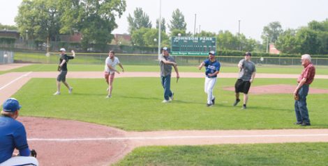 Staff photo by Travis Rosenau Ryan Walters, Aaron Schaper, Mike French, Chris Cariveau, Connor Schaper and Bob Scharf all throw out the first pitch before New Ulm’s Tomahawk East League game with Springfield on Sunday at Johnson Park.