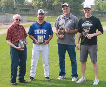 Staff photo by Travis Rosenau (From left to right) Bob “Biscuits” Scharf, Chris Cariveau, Mike French and Ryan Walters pose with their New Ulm Amatuer Baseball Hall of Fame plaques before New Ulm’s game with Springfield at Johnson Park on Sunday.